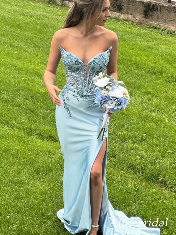 Stunning Blue Lace Appliques Strapless Mermaid Prom Dress with Slit, Evening Dress, PD3823045