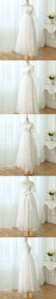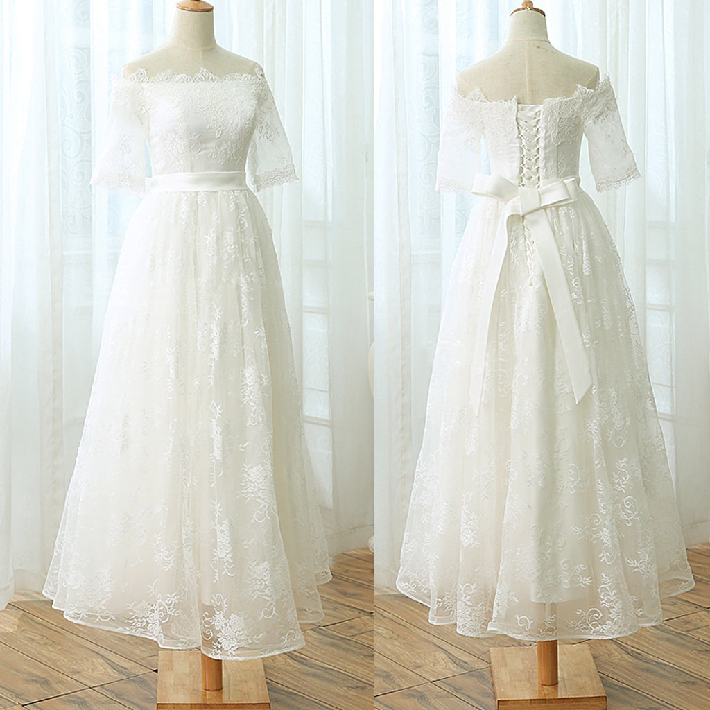 Off Shoulder Sabrina Neck Full Lace Half Sleeve Elegant Ankle-Length Wedding Dress, AB1102