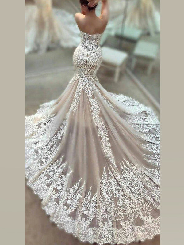 Sexy Luxury Strapless Sweetheart Mermaid Lace Long Train Wedding Dress, WD3045