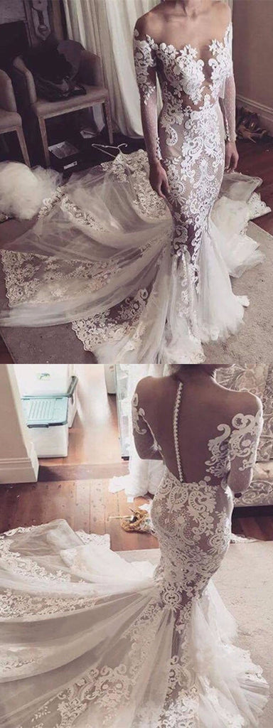 Sexy Mermaid Lace See Through Tulle Long Sleeve Off Shoulder Yarn Back Wedding Dress, AB1109