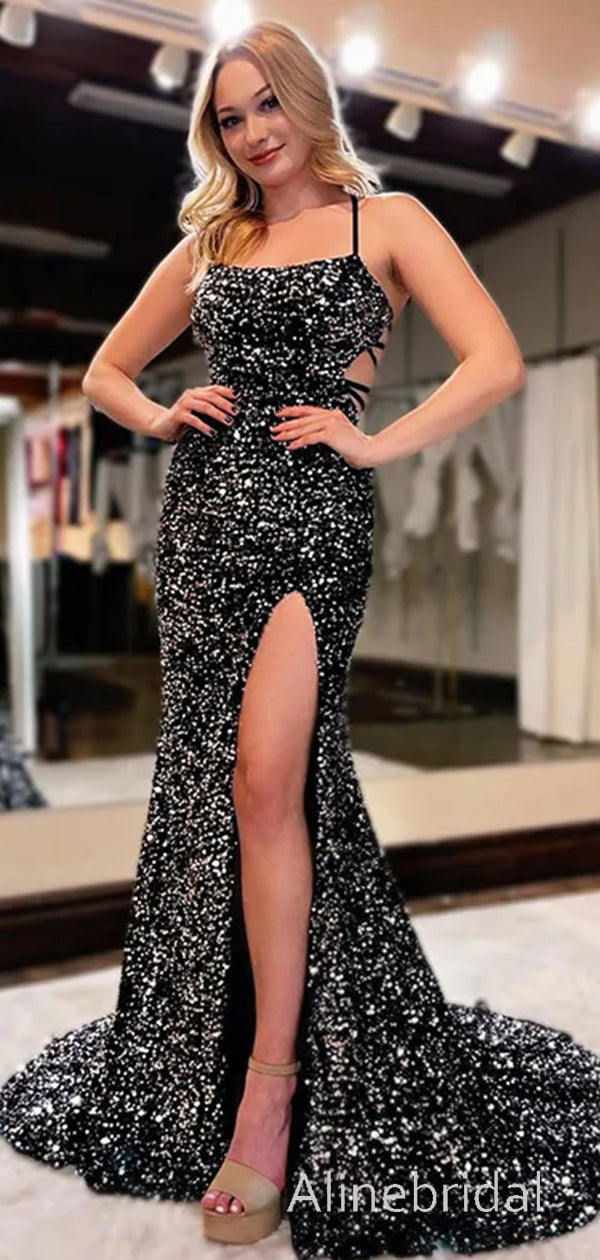 Sparkly Side Slit Black Sequins Mermaid Prom Dress, Long Cut Out Evening Dress, PD3823016