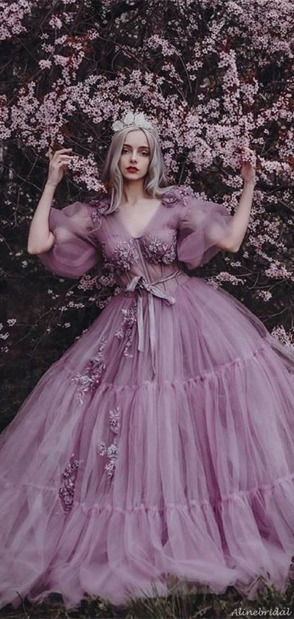 Elegant Lavender V-neck Half-sleeve Tulle A-line Long Prom Dress, PD3225