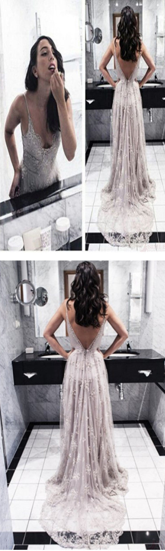 Sexy V-Back Lace Prom Dresses, Popular Backless Tulle Bridal Gown Wedding Dresses